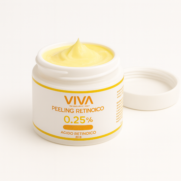 Nuestra Crema Peeling Retinóico 0.25% es un tratamiento de renovación intensiva diseñado para mejorar la textura de la piel, suavizar líneas finas y unificar el tono. Su concentración profesional de Retinoic Acid 0.25% actúa estimulando la regeneración celular, favoreciendo una piel más luminosa, rejuvenecida y visiblemente renovada.